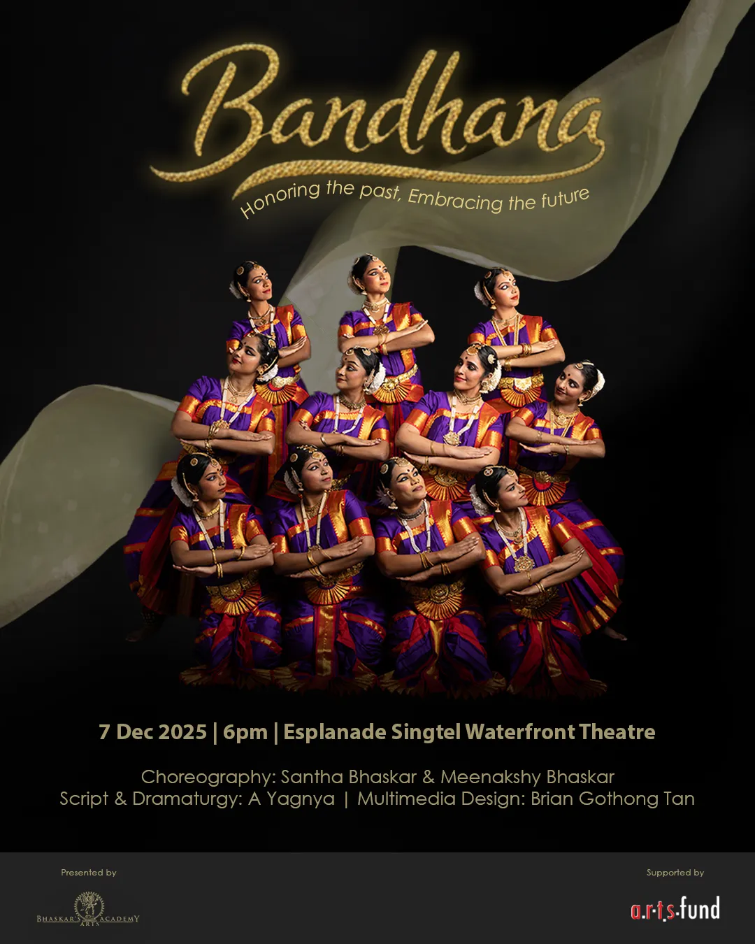 Bandhana pays tribute to lineage, legacy, and continuity by featuring selected excerpts from the repertoire of BAA’s late Artistic Director and Cultural Medallion recipient, Santha Bhaskar, an iconic pioneer whose intercultural vision continues to shape the identity of BAA and Singapore’s arts landscape.