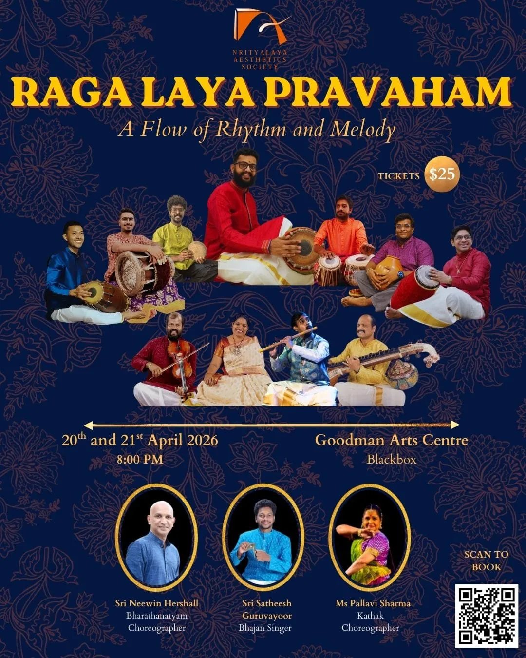 Immerse yourself in the primal pulse of India!Featuring a stellar lineup of rhythm specialists led by Bhaskar's Arts Academy's resident percussionist Nelluvai Ragesh, Raga Laya Pravaham showcases the mesmerising beats and patterns of the mridangam, tabla, ghatam, kanjiraa, and more.